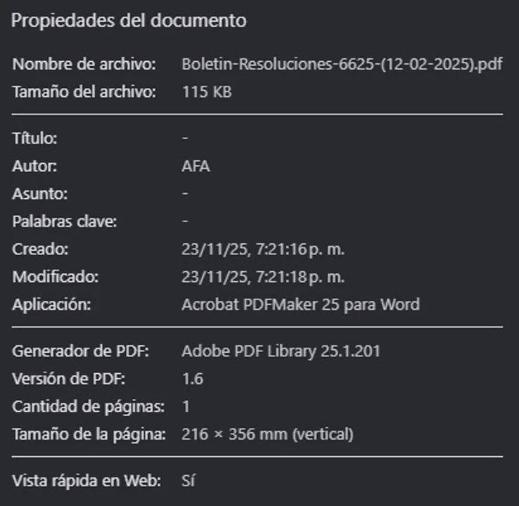 El documento en el que se ampara la AFA para sancionar a Estudiantes es el Boletín N°6625, cuya fecha data del 12 de febrero del 2025, pero cuando se ingresa a los detalles del PDF se observa que fue creado el 23 de noviembre a las 19:21, en pleno encuentro entre el “Pincha” y Rosario Central, según pudo saber la Agencia Noticias Argentinas.